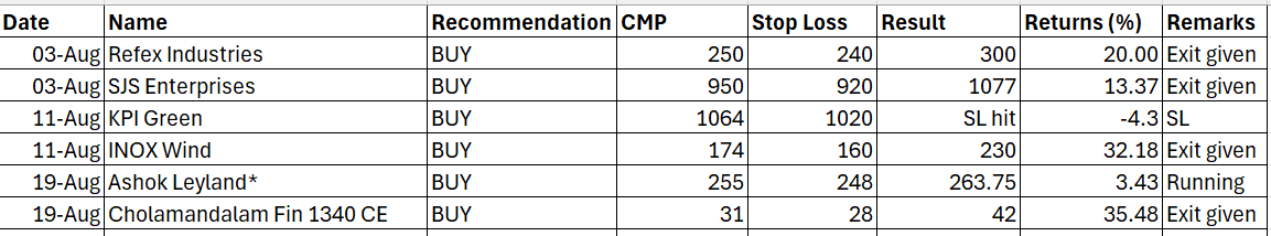 Chola Fin 1340 CE call was a pure F&O pick as we had mentioned in The Money Memo, Aug 3rd Edition and it has been our best pick this month with 35% profits. Our charts were nicely lined up for this move, and many of our subscribers were able to quickly enter and exit at the right levels as the stock price went from 1347 to 1360 within a week.